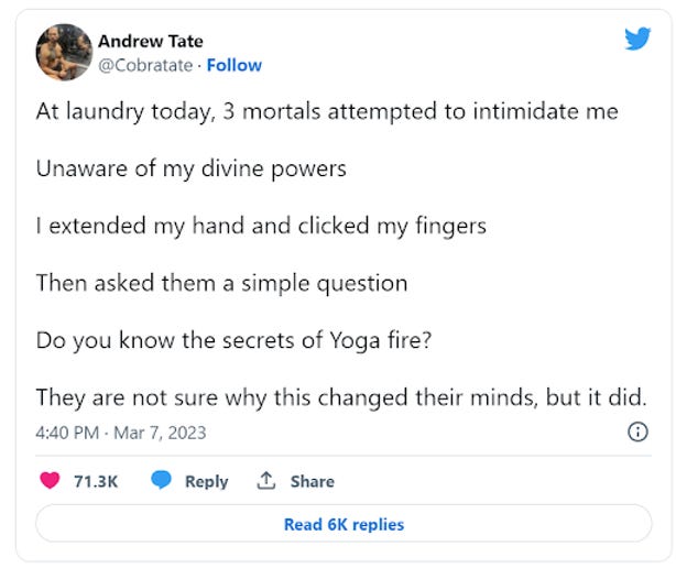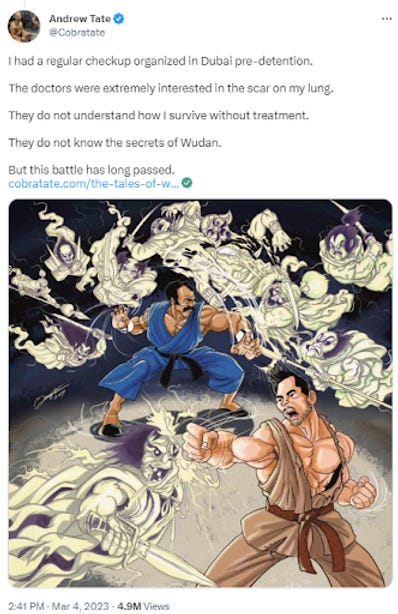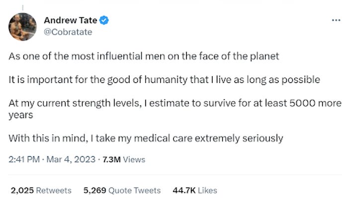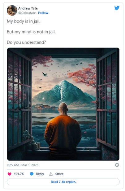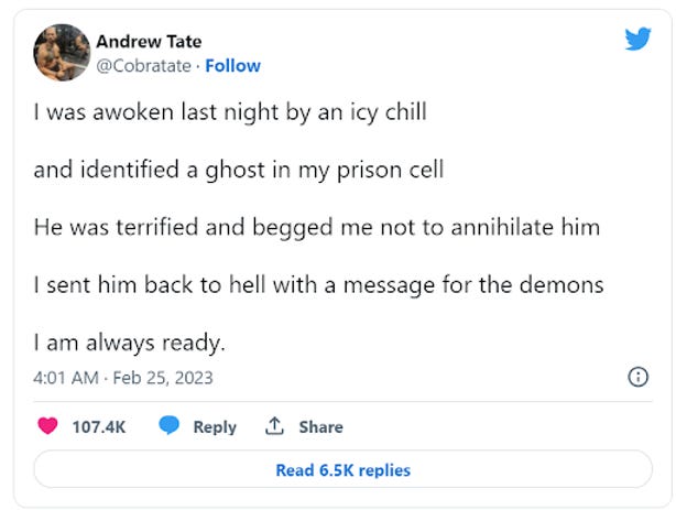 Guess which sex trafficker is out of prison this week! Here’s a hint: it’s not Andrew Tate. The cold walls of the Romanian prison that the beta male is rotting in must have brought out his artistic side. Ever since his incarceration in December of 2022, he has been writing very beautiful poems from his cell to assure his disciples that he is still their wittle cutesy poopsie Top G.