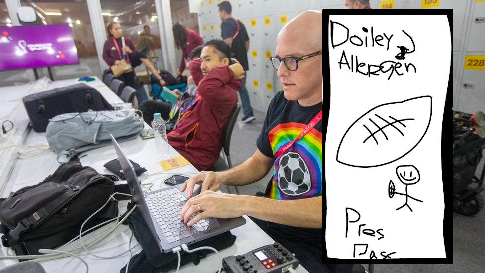 I stepped in line with the rest of the journalists. I tried to make small talk, but they seemed to be shy, only managing to mutter things like “We don’t give a shit,” and “Who invited these motherfuckers?” The gates opened, and we all started pouring into the stadium. When it came my turn to show the pass, I revealed my personal creation, all in its Doily glory. Security wasn’t impressed, however, and they demanded I step out of line and purchase a real ticket. I refused. How dare they demand I miss out on my right as a journalist?!