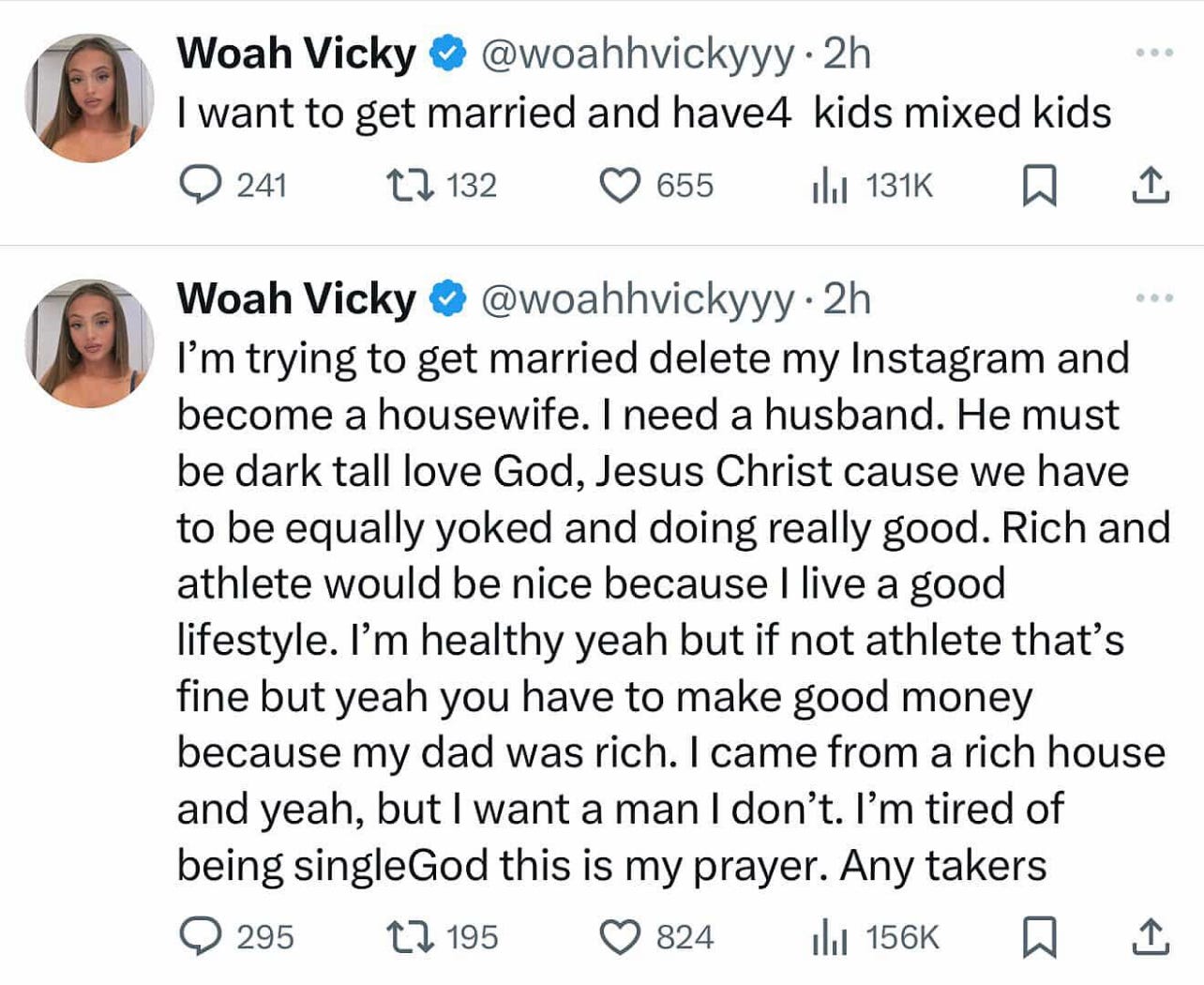 Recently Woah Vicky announced she would become a full time house-wife, stepping away from social media. Never fear! She is still very active, especially on X. On December 29th, 2024 at 8:24 AM, @woahhvickyyy tweeted “I have kidnapped vicky. she is with me in nigeria. i am demanding $1million for her release”.