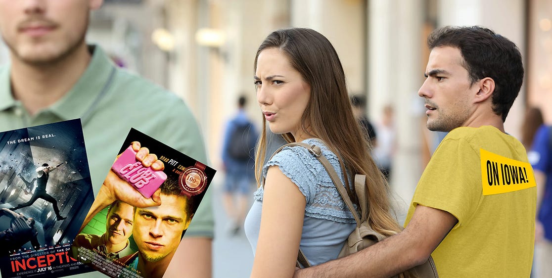 Freshman student, Schmidt Stane, was facing a similar dilemma as baby me during his second week in Iowa City. He’d been too busy doing bonding exercises and playing hacky sack during On Iowa! to give much care to his living arrangements––leaving most of the heavy lifting to his roommate, Whizzer––but he began to notice, during his first week of classes, just how barren his surroundings were. The concern was brought to light by his loving girlfriend, whom he’d been in a long-term relationship with for four days. She’d first visited his room after a high-tension bonding exercise at the Quad, and after pointing out how impersonal his walls were, Schmidt was determined to dissuade her fears of his blank-slatedness. How dare she accuse him of not having a personality! He saw Morgan Wallen in concert and watched at least three episodes of The Sopranos, that should constitute enough of a personality! He had to show her, so once he saw signs for a poster sale, he seized his opportunity.