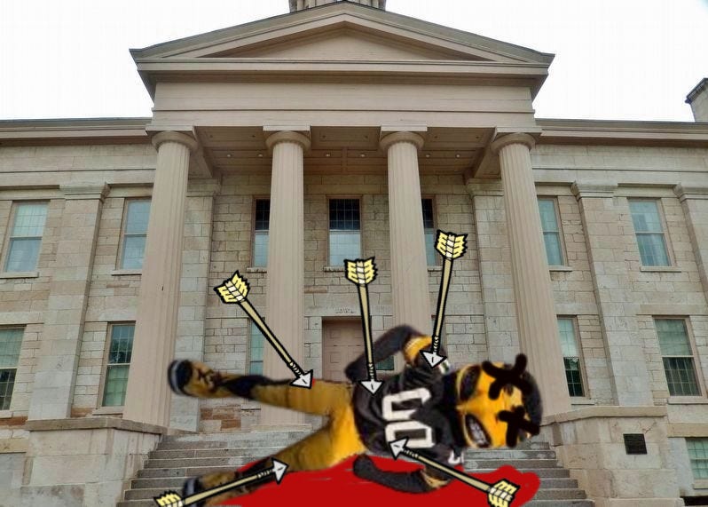 Early this morning, Herky the Hawk’s feathered corpse was found on the steps of the Old Capitol building. He had died from numerous arrow wounds and rifle shots. Mr. The Hawk was 75, and a beloved mascot for the university.