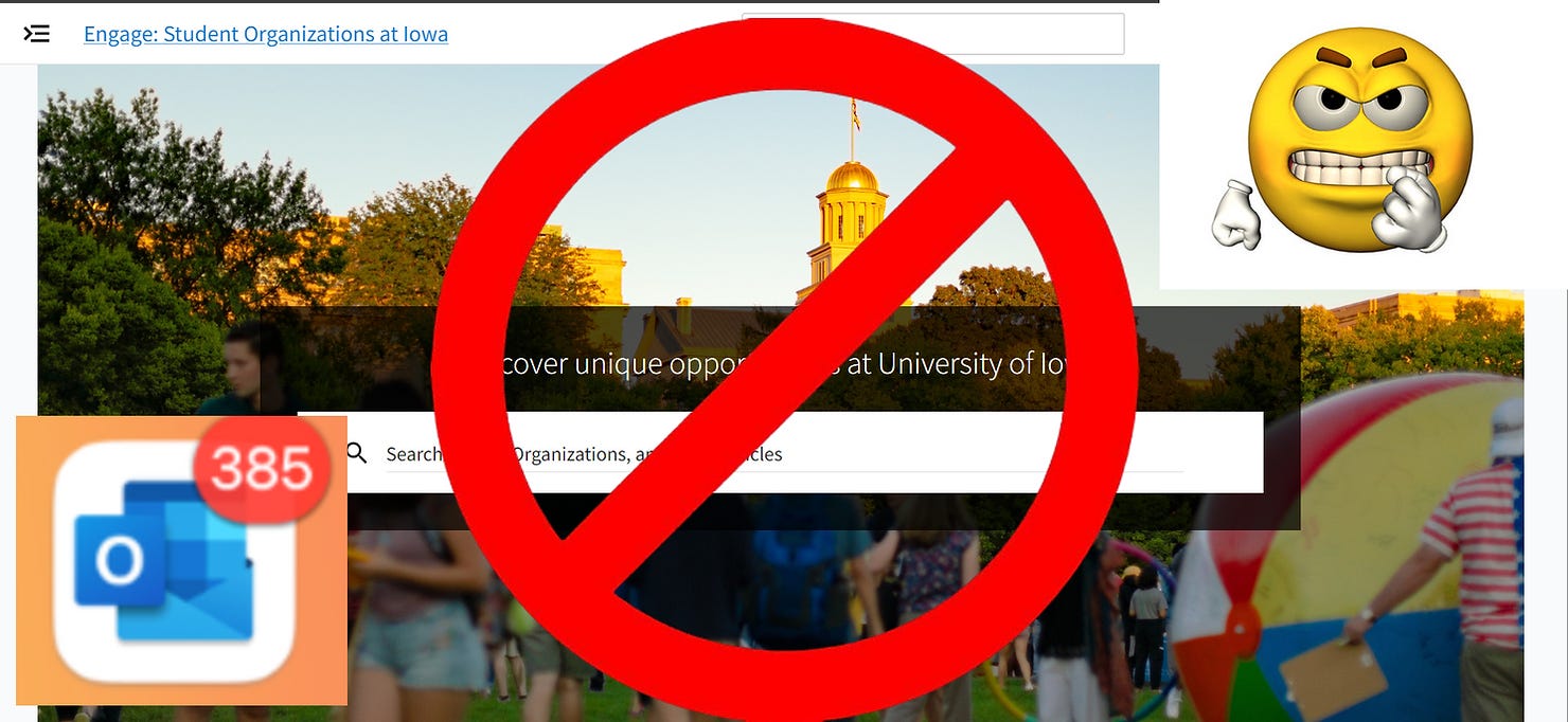 Unfortunately, Engage also has a super secret function that every single organization has somehow managed to discover! With one simple form, you can send an email to everyone with an email ending in @uiowa.edu.