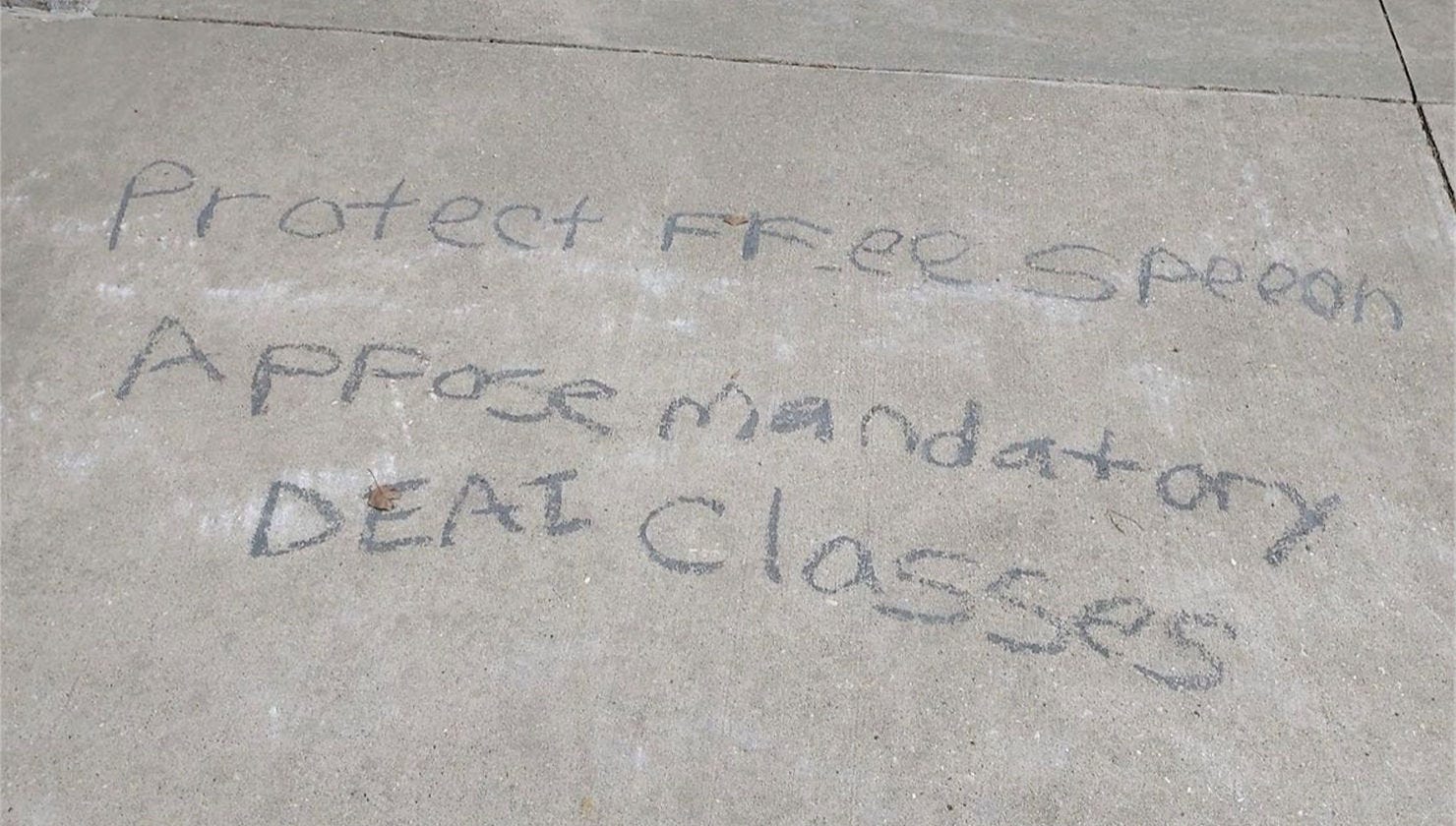 “Our chalking aims to eliminate DEI so that the beautiful white kids of our University can finally have a fighting chance at success,” Ruckus said.