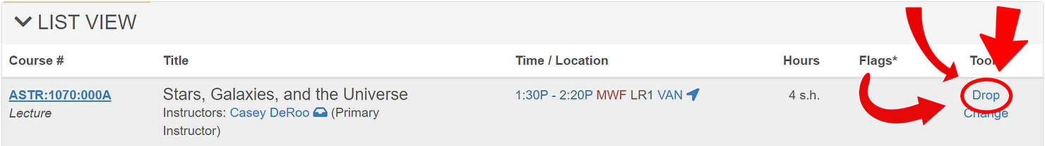 Look through the list of your courses (all of which you’re clearly too stupid to comprehend the material and should probably just drop out entirely, but that’s another article), and find the course you wish to drop. In the row of the course you want to drop, in case it isn’t apparent to the single neuron residing in your oversized skull, click on the Drop link.