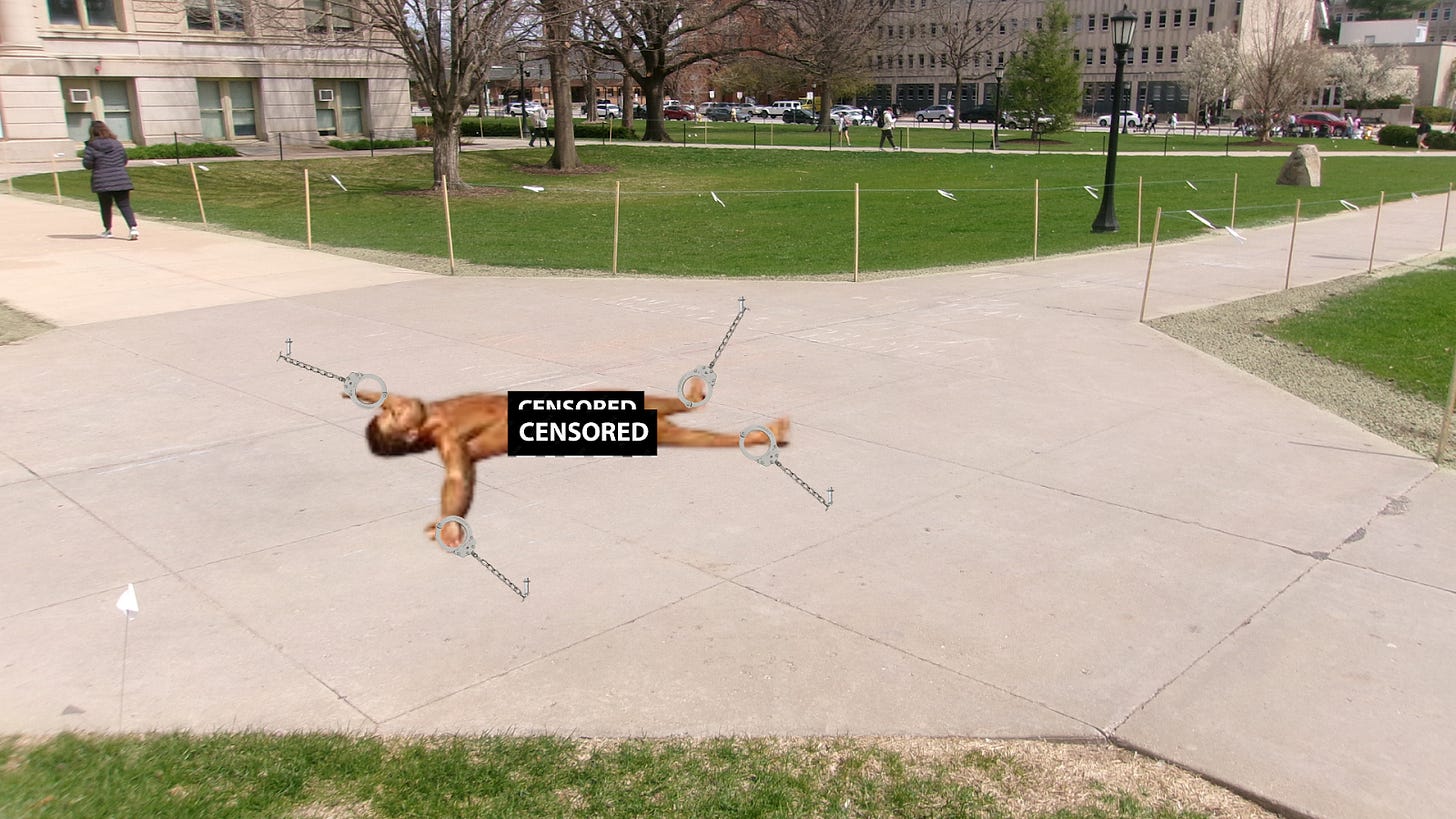 This past Monday, smack-dab in the middle of the Pentacrest where the four paths meet, underneath the cold, bleak, zero-UV clouds, a University of Iowa student was found tanning: limp, almost lifeless, displaying his meaty, hard nipples for everyone to see; however, what was most jarring, most cruel, and most ludicrous about this finding was that he was naked. Completely naked. Naked in the wind, naked, letting the smallest sliver of sun seep into his white skin, naked and letting the wind blow his little pecker from one side to the other, naked, yet not afraid.