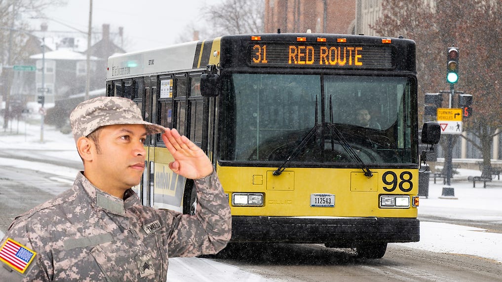 When asked what will change about his life now that he has this new honor, Bussin told Doily, “I hope now nobody that gets on my bus will talk shit about my music choices. And I guess my grandpa and I have something to finally bond over.” He then promptly dropped the Purple Heart, since he was wearing big mittens and couldn’t grab anything properly.
