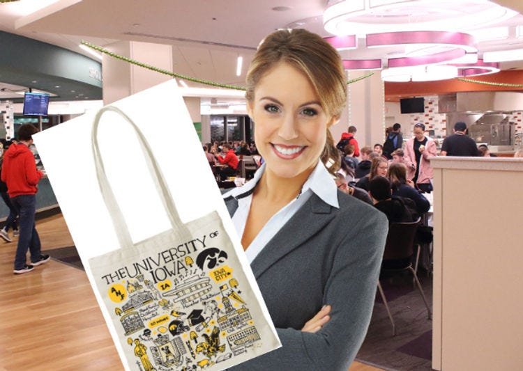 Tara Harasway is proud to be a (potential) Hawkeye mom. In her dining hall visit, she was sure to grill the student worker within an inch of their life. How many swipes? What is a flex swipe? How many flex swipes? What do you mean they won’t have flex swipes anymore?