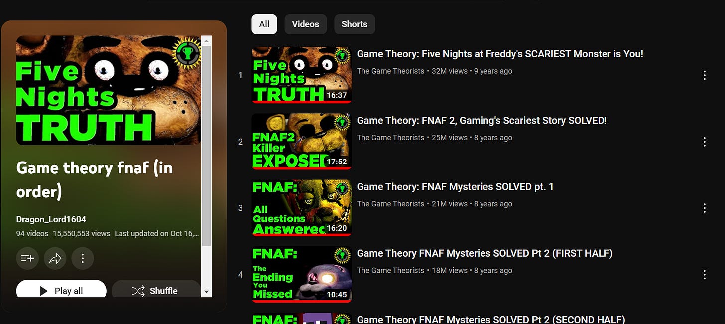 Matthew Patrick, or “MatPat”, is his opponent of over a decade through his YouTube channel Game Theory, where he led the charge to find an actual in-depth timeline within Cawthon’s weird little robot horror games. MatPat has 94 videos concerning FNAF, all with the same thumbnail of a close-up on some detail in Freddy’s face and bold block text underneath declaring something “answered” or “solved.”