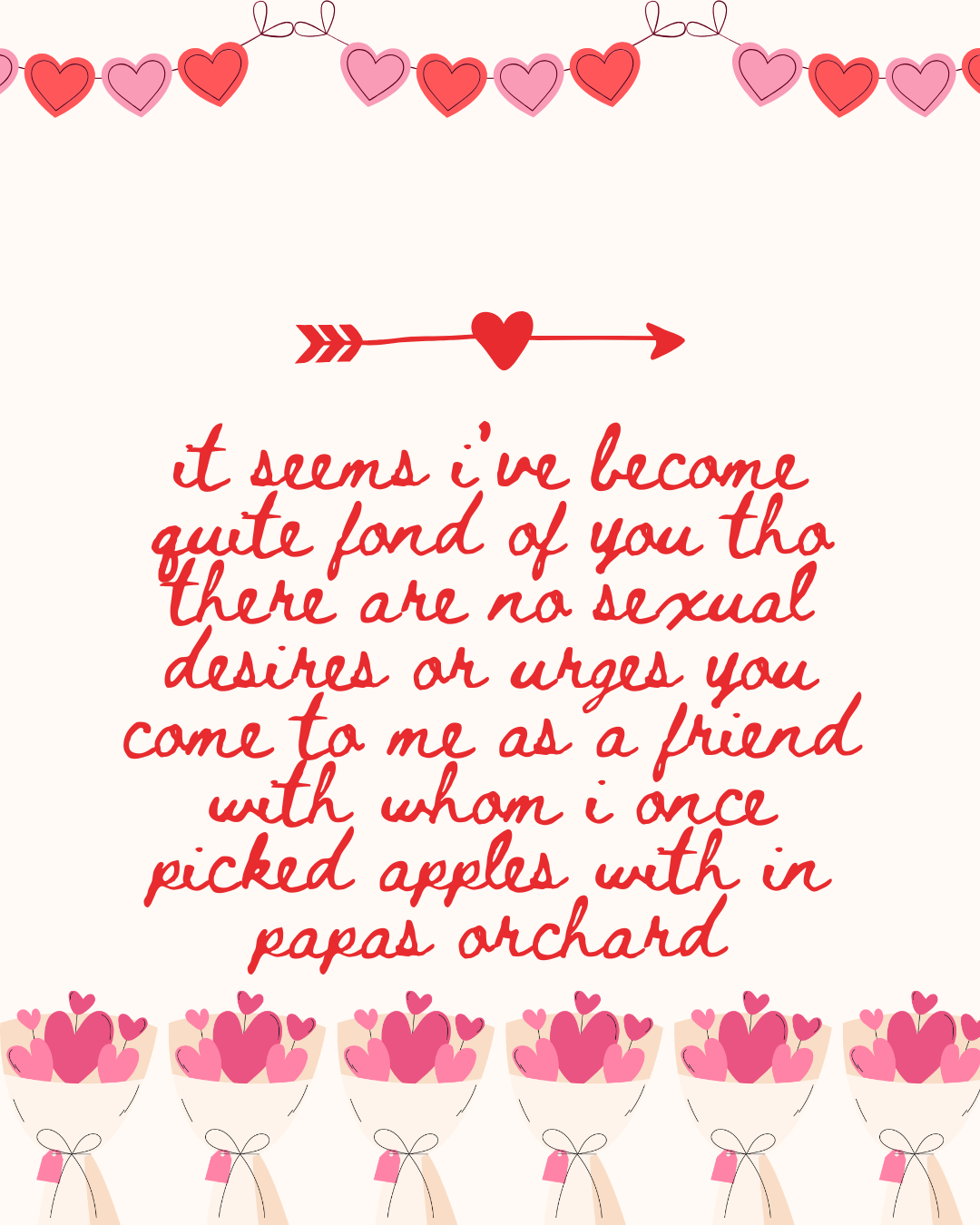 “it seems i’ve become quite fond of you tho there are no sexual desires or urges you come to me as a friend with whom i once picked apples with in papas orchard”